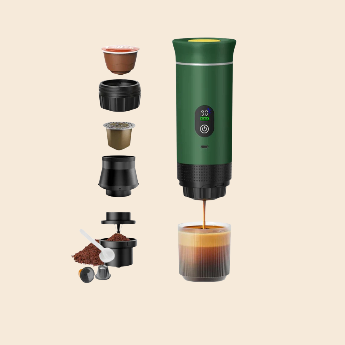 Buying coffee outside costs more than you think. With this portable coffee maker, you can enjoy your favorite espresso for just cents, anytime and anywhere, compatible with Nespresso®, Dolce Gusto®, and ground coffee.